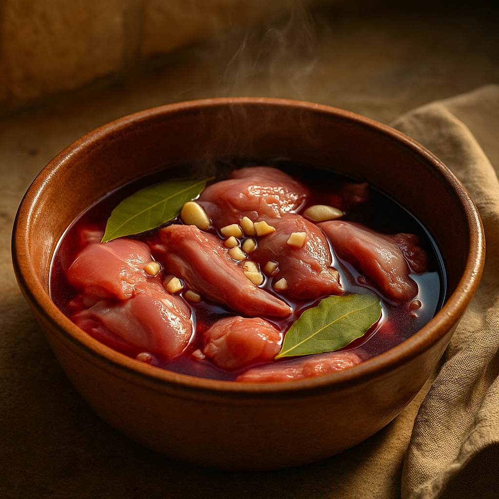 - Pregătirea acestui fel de mâncare începe cu un gest simplu, dar plin de răbdare: iepurele se taie în bucăți egale, atent curățate, apoi se acoperă cu vin roșu parfumat, care va deveni sufletul sosului. Așa începe marinada, ce trebuie să-și facă magia lent, peste noapte, în răcoarea bucătăriei. Vinul îmbracă carnea într-o nuanță purpurie, iar usturoiul, adăugat zdrobit, îi dă o adâncime de aromă ce se simte încă din zori.
