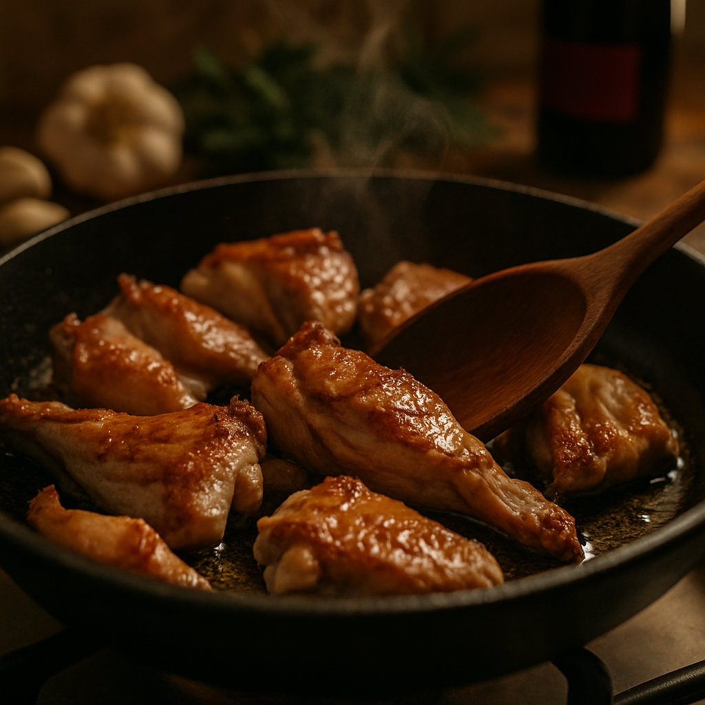 A doua zi, într-o tigaie mare, grea, de fontă, se încălzește uleiul de măsline până când capătă luciul acela ușor tremurător. Se adaugă căței de usturoi întregi, care încep imediat să parfumeze aerul cu mirosul lor dulceag și ușor picant. Apoi vin bucățile de iepure – carne fragedă, alb-rozalie, ce prinde repede o crustă aurie. Se rumenesc cu grijă pe toate părțile, până când fiecare bucată capătă o tentă caldă de caramel.Rumenirea