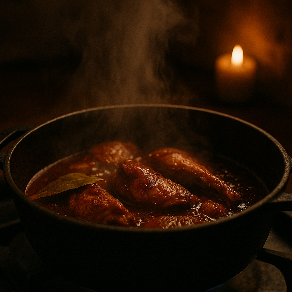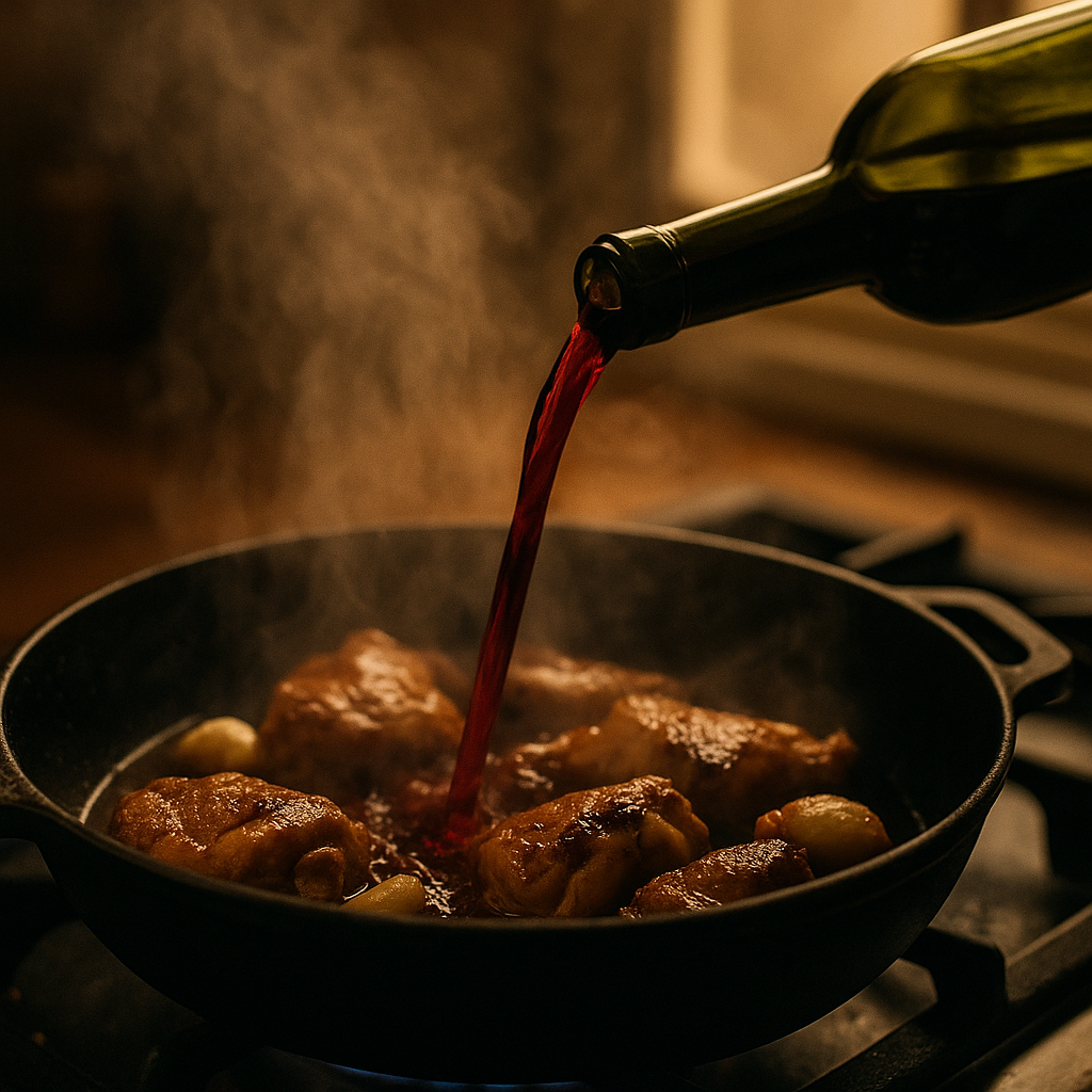 Când carnea este frumos rumenită, vinul din marinadă este turnat peste iepure, ridicând un abur dens și aromat. Se aude acel sunet inconfundabil al vinului care întâlnește fierbințeala uleiului, iar mirosul devine hipnotic — un amestec de fructe roșii, usturoi și pământ reavăn. Se adaugă două frunze de dafin, sare și piper, iar apoi vasul se acoperă, lăsându-se la foc mic, timp îndelungat.Turnarea vinului